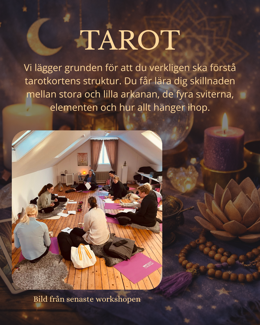 Vi börjar dagen med ett skönt yinyogapass, tar sedan en bensträckare/lättare fika, och dyker efter det ner i tarotkortens värld.